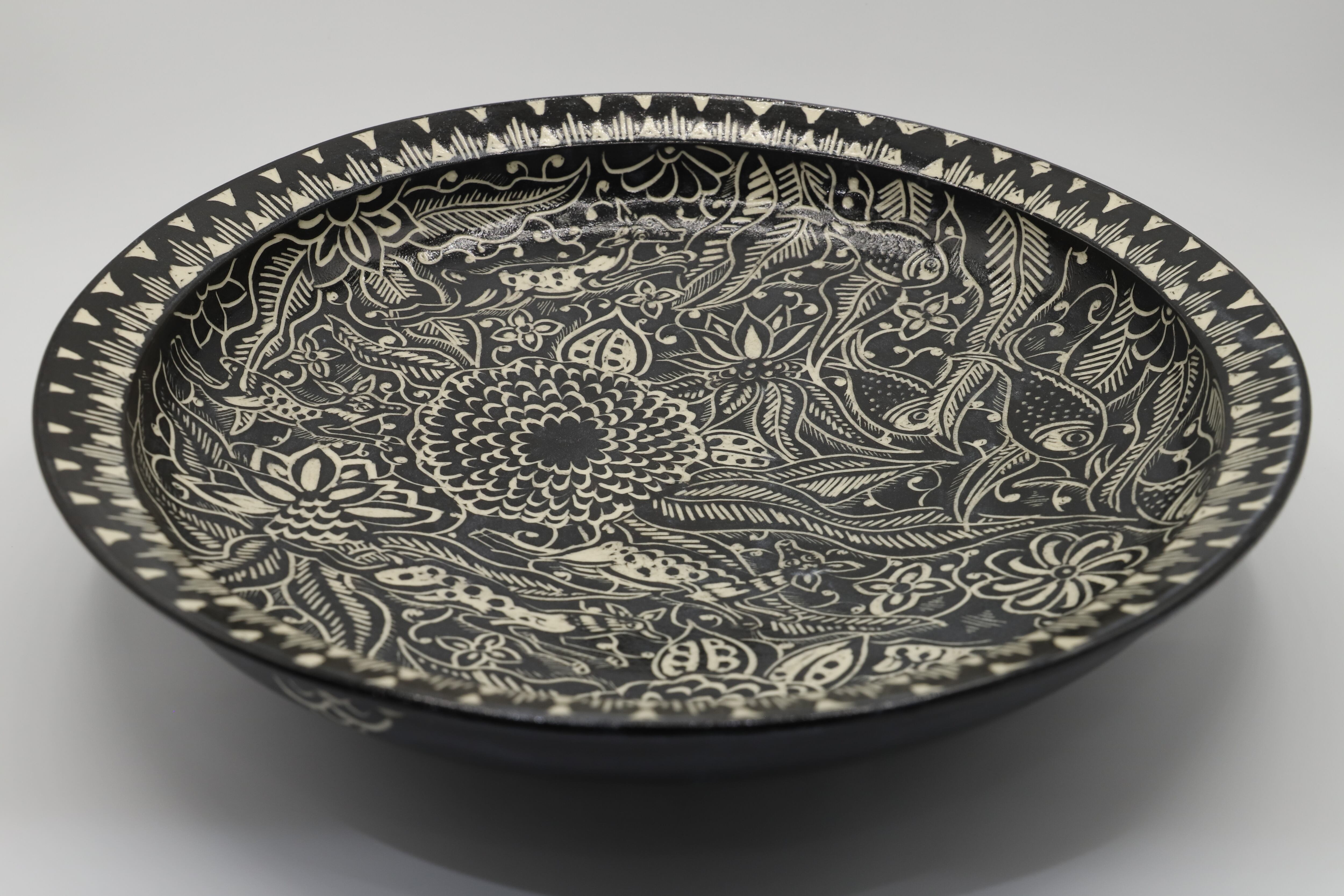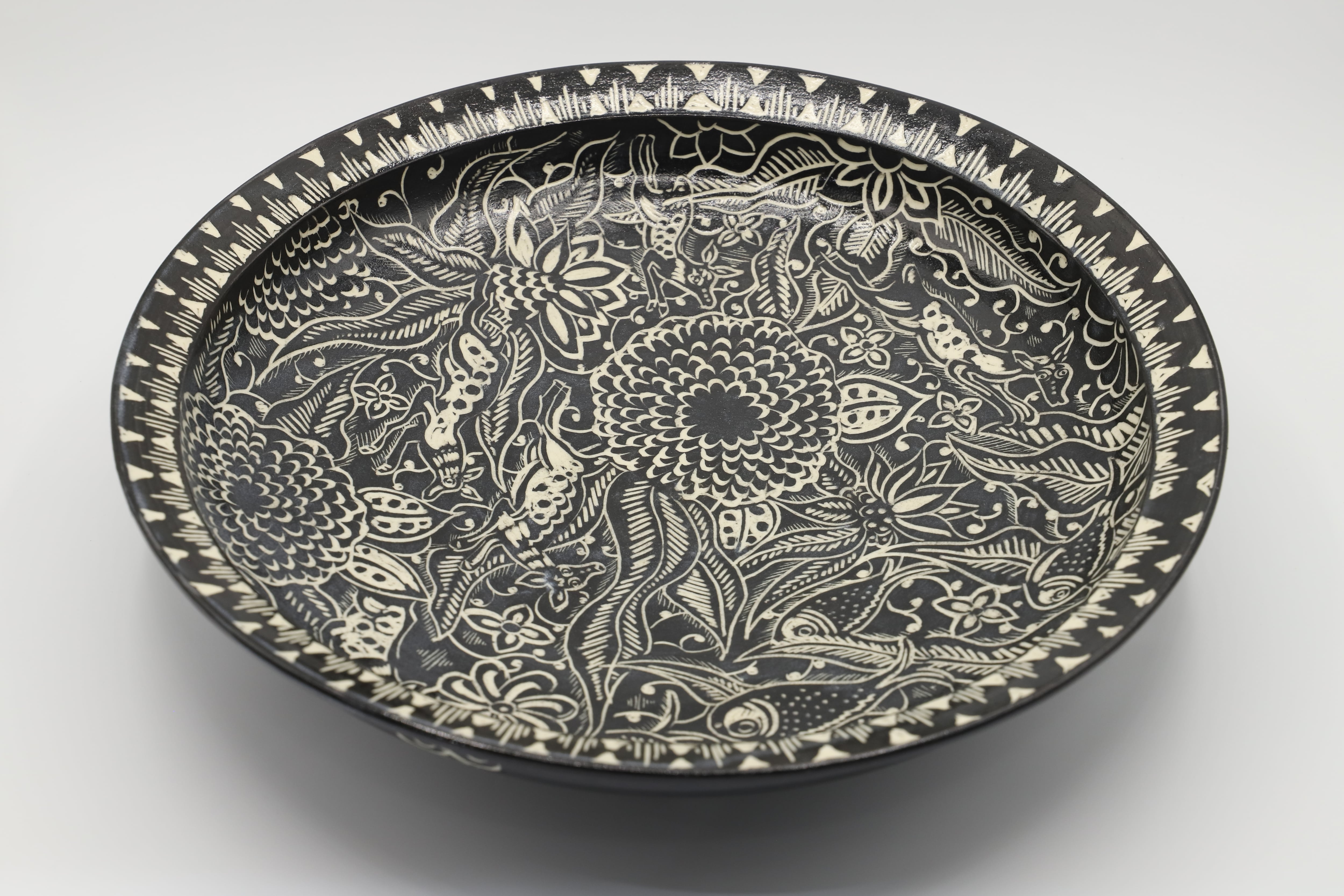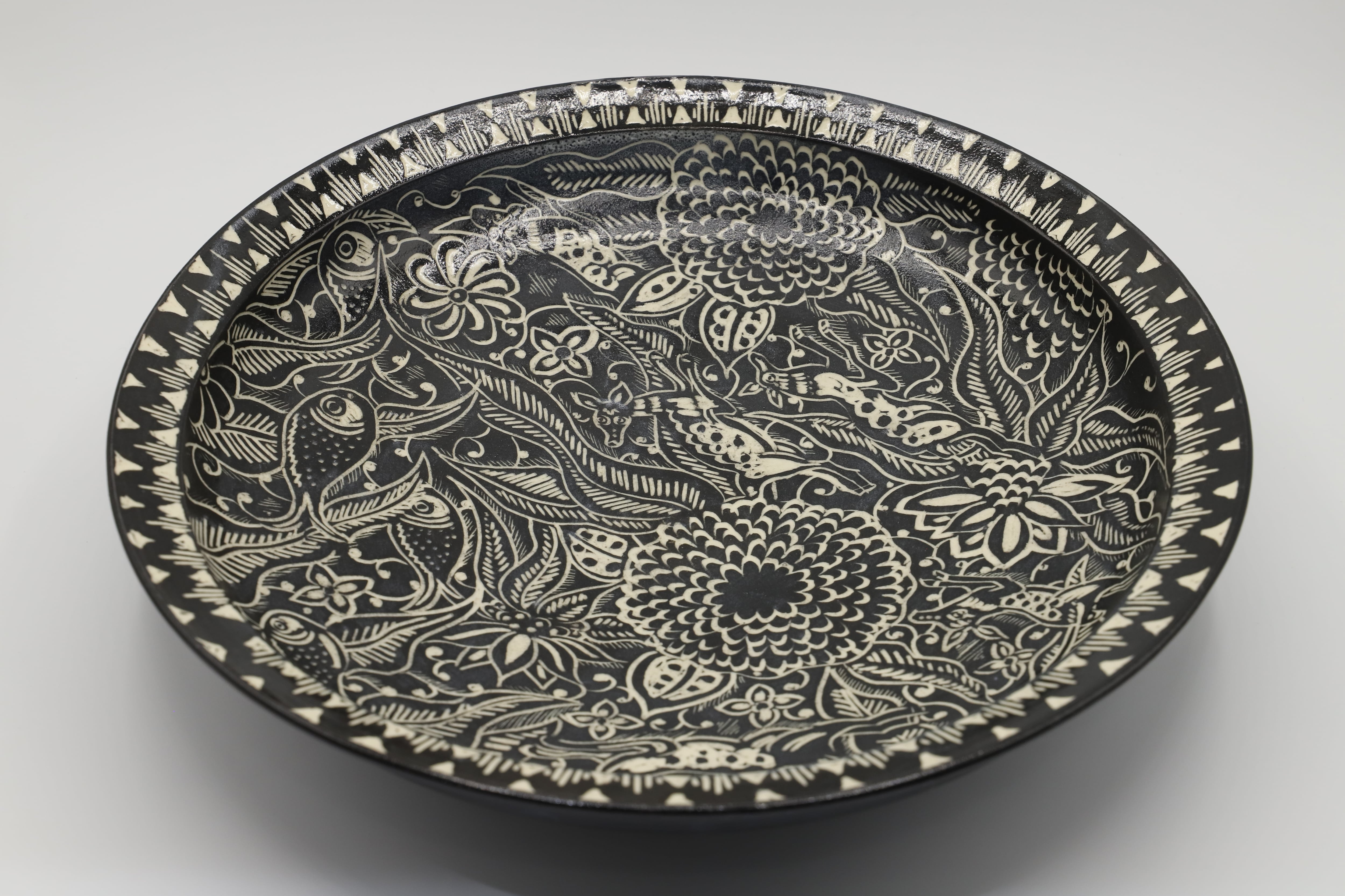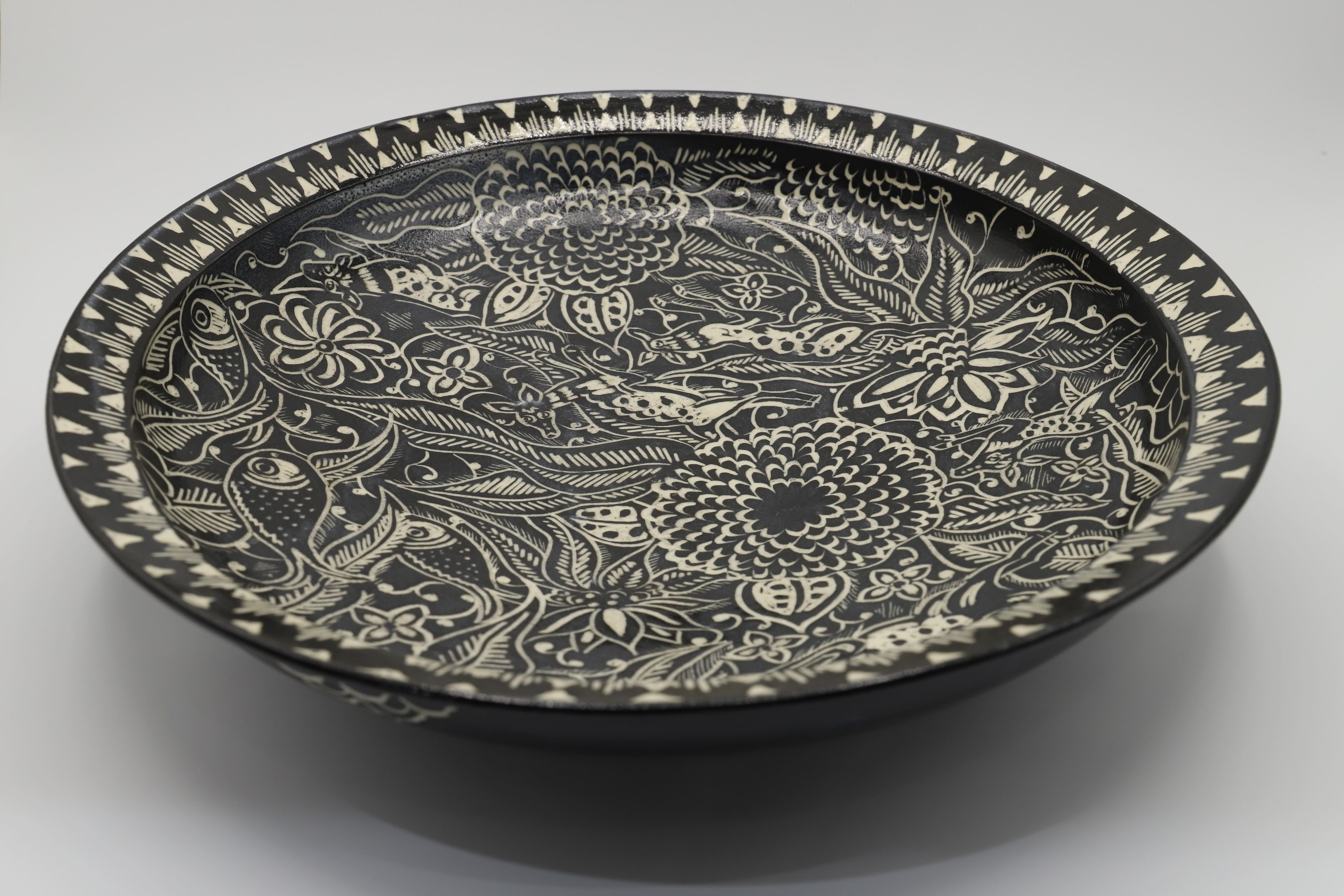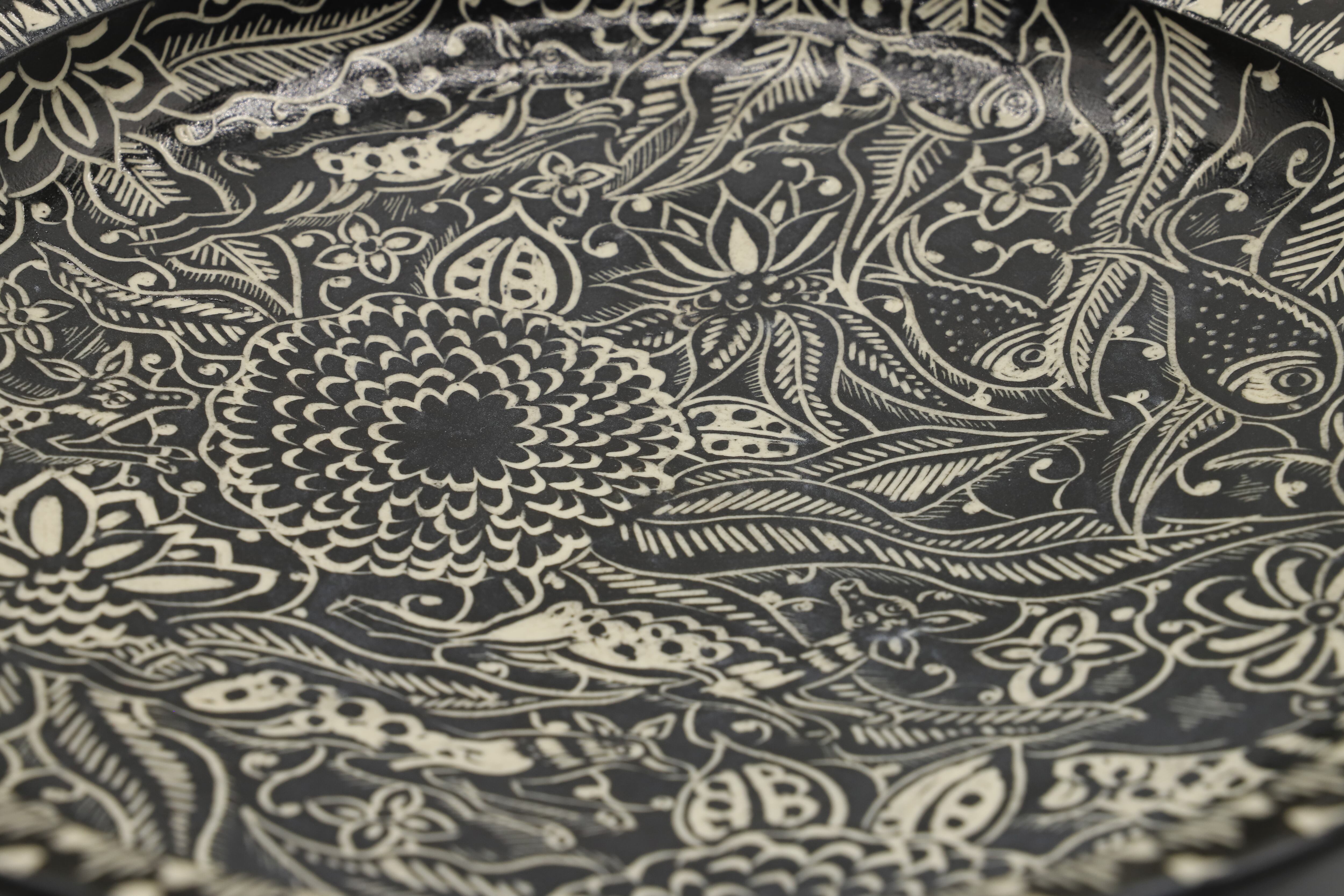 直径30cmを超える大きなお鉢に掻き落とし(カキオトシ)の技法を用いて
