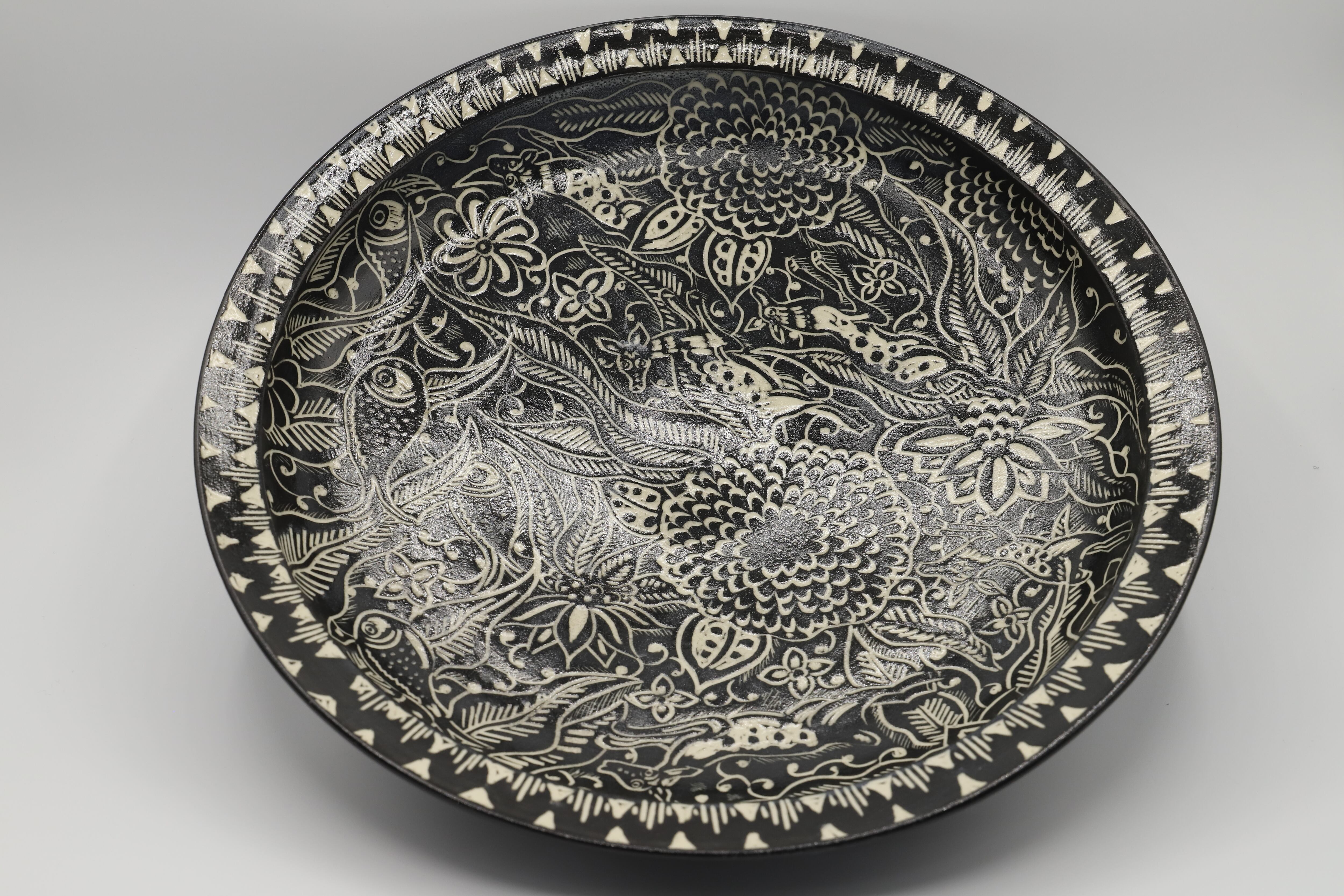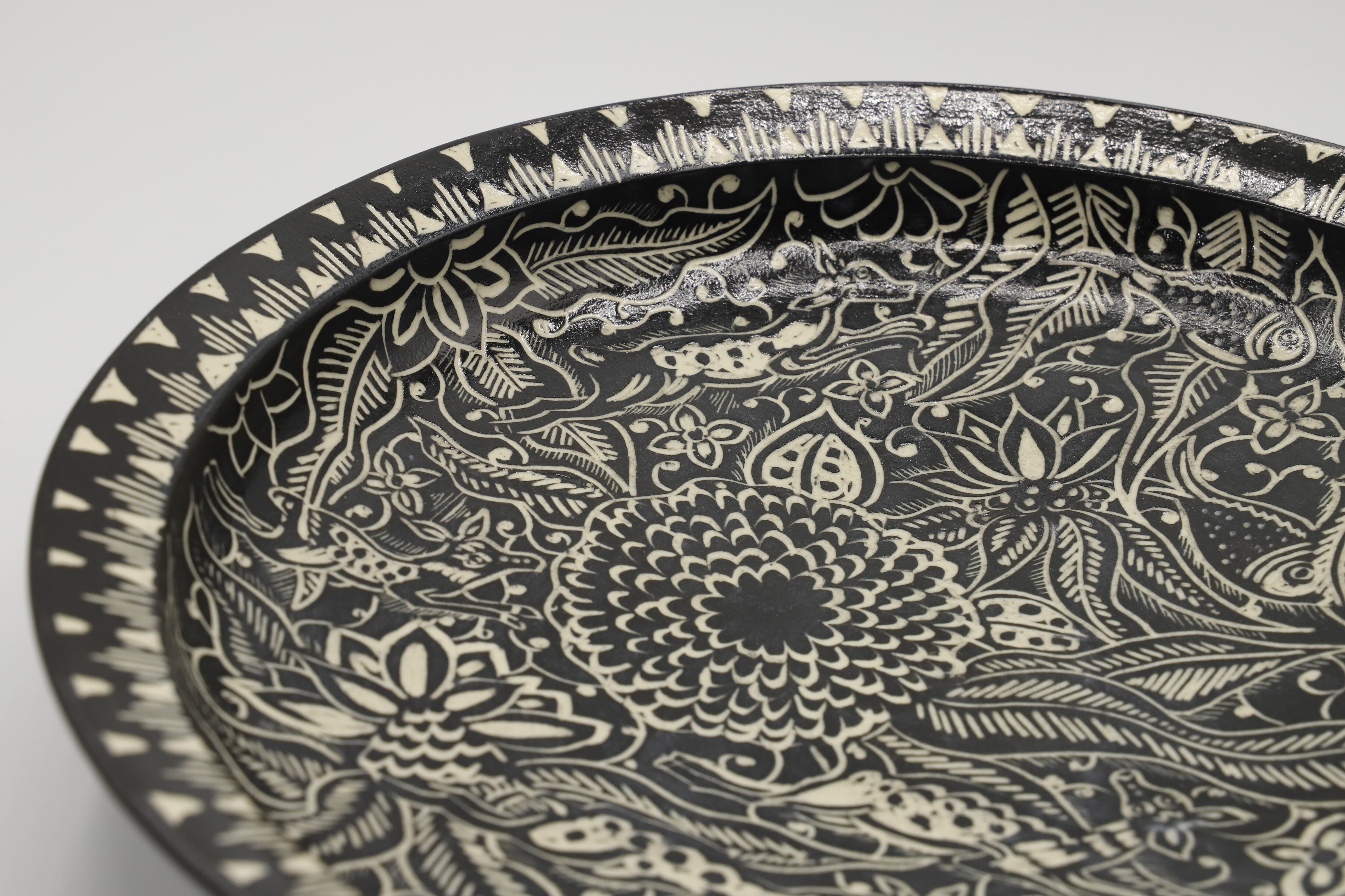 白い土の上に黒い化粧土を施した後、道具を使って黒い土を削りとる事で