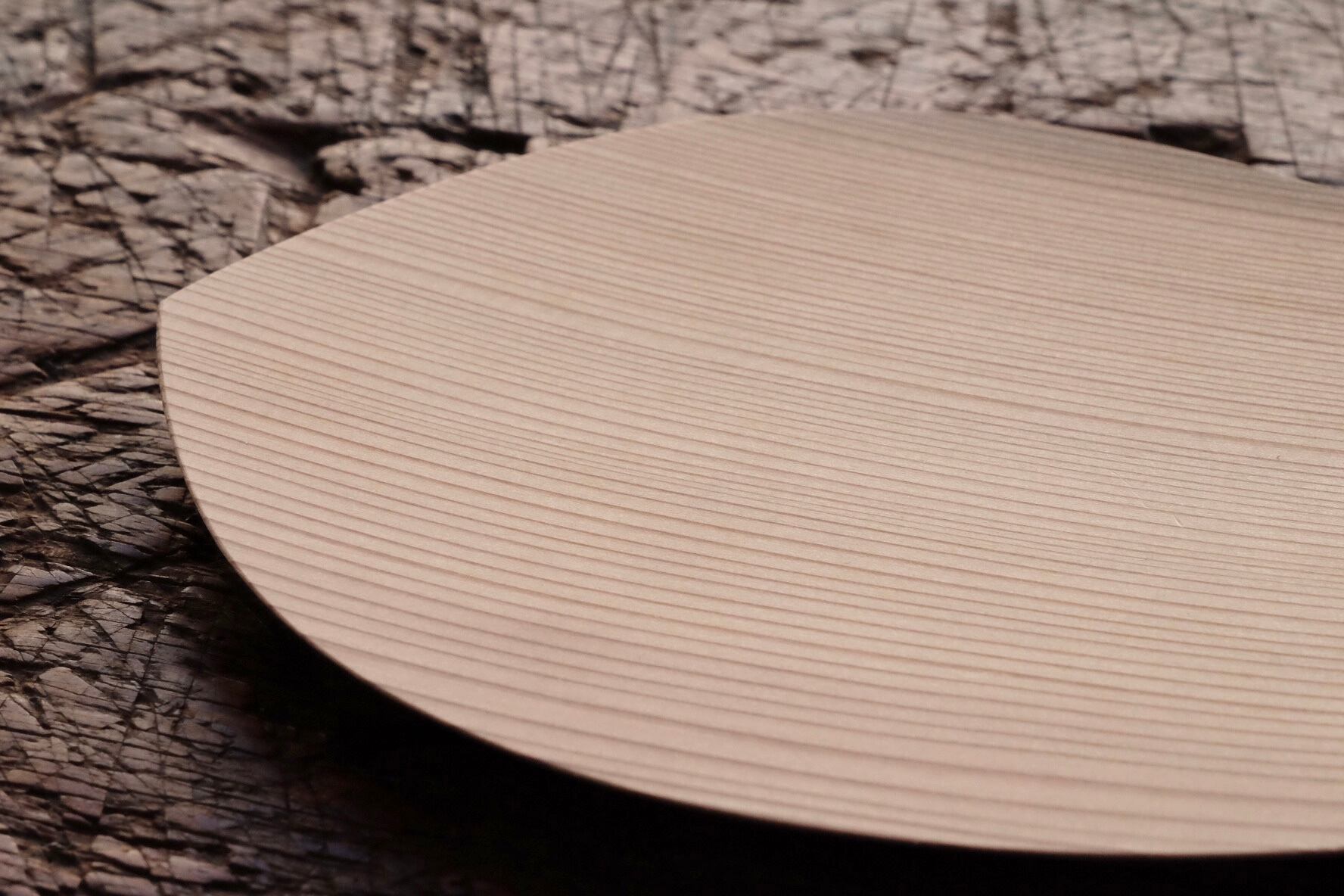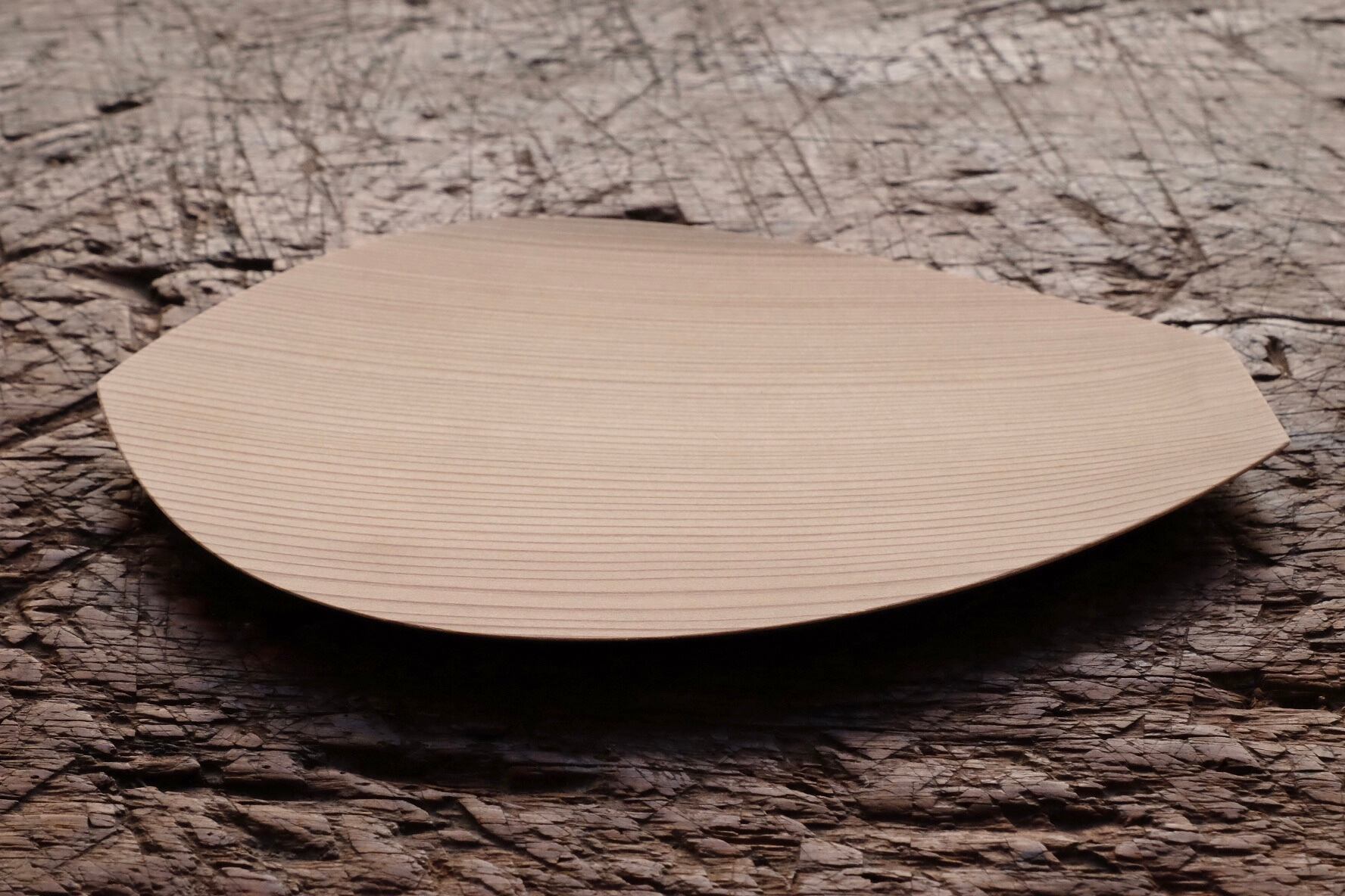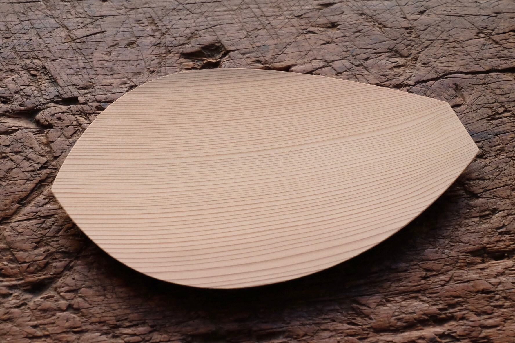 蓮の花弁が舞い降りたような軽やかなお皿は、杉が使われて木目が印象的です。
