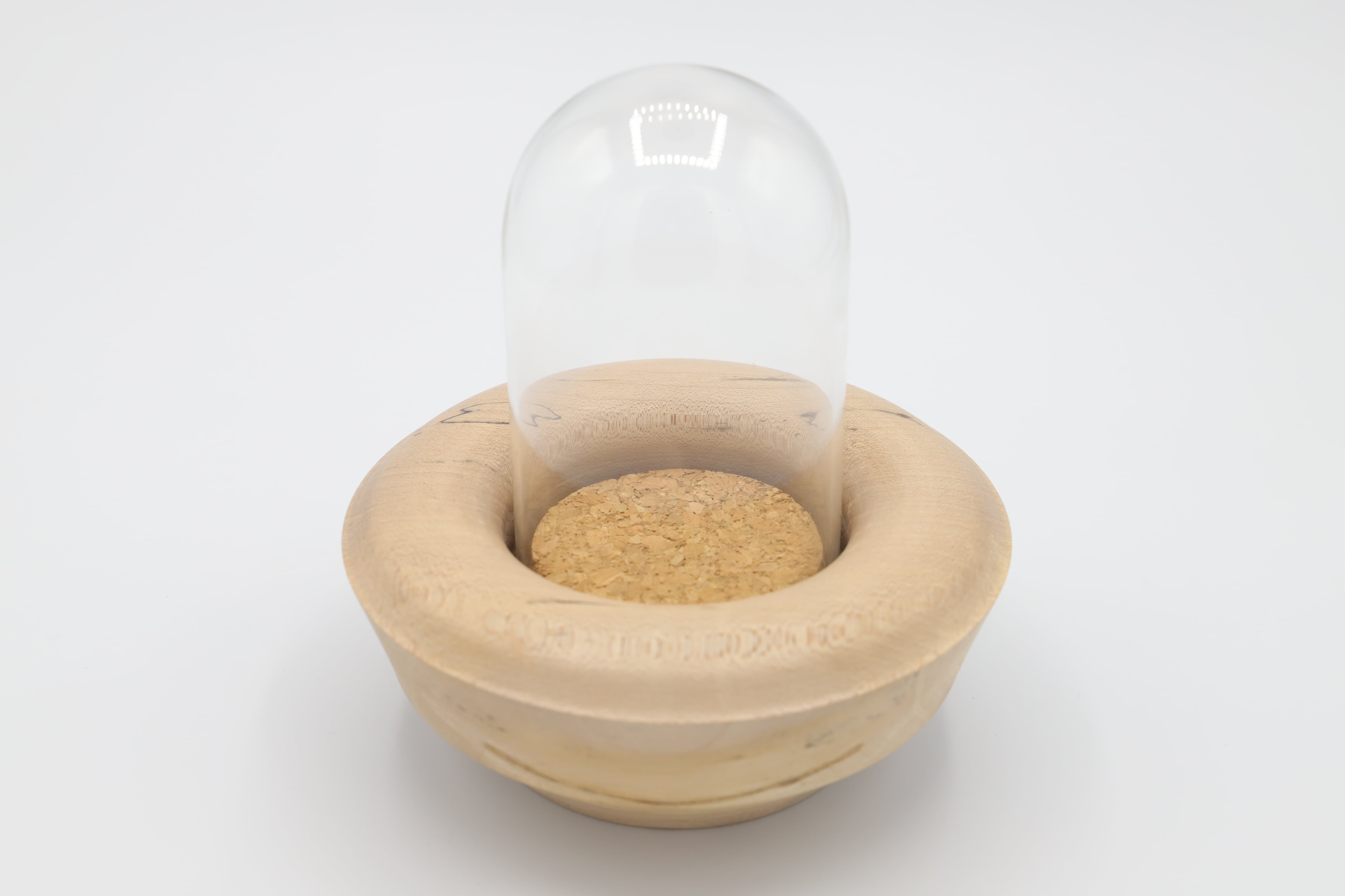 カエデの木の土台とガラスドームが組み合わさった花器です。